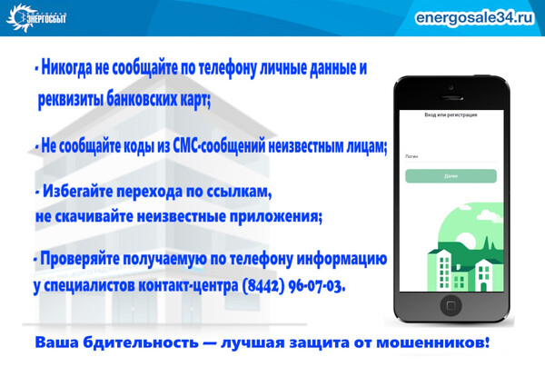 При поступлении звонков с подобными предложениями для уточнения информации Вы можете связаться со специалистами контакт-центра ПАО «Волгоградэнергосбыт» через личный кабинет на сайте Компании, мобильное приложение или по телефону 96-07-03.